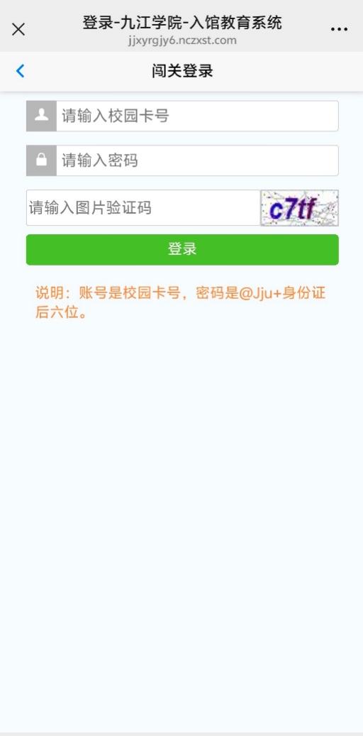 依次点击“开始闯关”“点击登录”“点击新生登录”图标,进入“闯关登录”页面。闯关登录,输入校园卡号和密码(密码格式:“@Jju+身份证后六位”)。