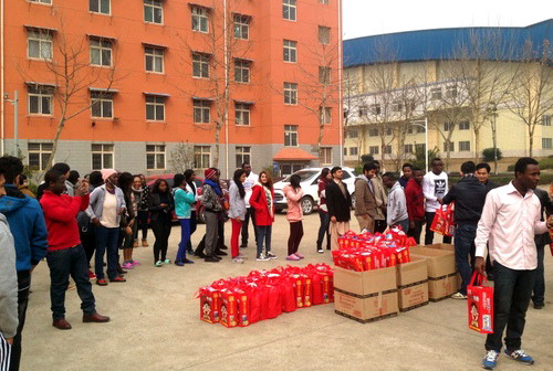 随后,杨耀防副校长代表学校向留学生们送上节日慰问品。收到节日礼物的留学生们兴高采烈,亲身感受到了学校送来的温暖和祝福。