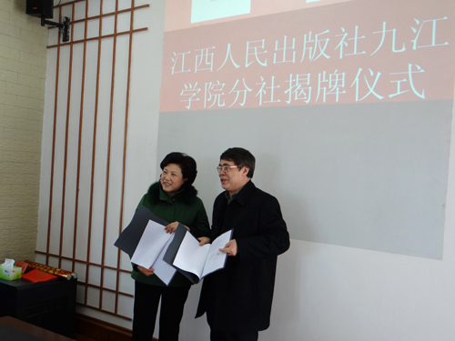 在热烈的掌声中,校党委书记郑翔,校长甘筱青,江西省出版集团公司副总经理、中文传媒股份有限公司总经理傅伟中,九江市文化广电新闻出版局局长柯亨龙共同为学院分社揭牌。江西人民出版社九江学院分社正式宣告成立。