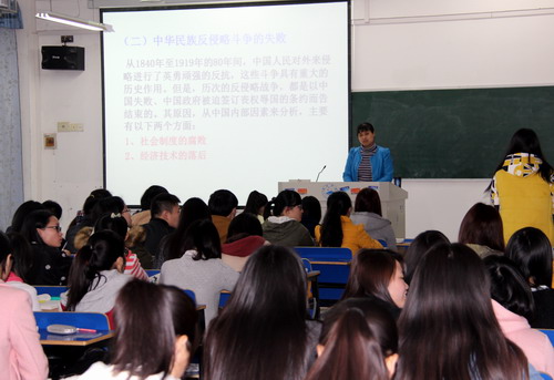 龚老师及同学们用热烈的掌声对吴桃娥副校长一行的到来表示了热烈欢迎。龚老师从举例提示入手,让同学们列举近代中国存在的落后腐败现象,引申和剖析了近代中华民族反侵略斗争失败的原因及民族意识的觉醒,并用简洁的课件及精彩的影音片段加深了同学们的直观印象。