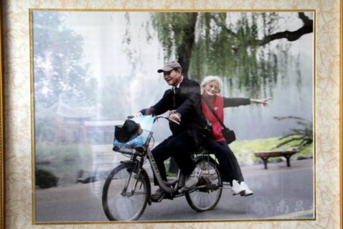 潘际銮院士还赠送我校师生一幅照片,祝愿全校师生员工“五一”佳节快乐、健康向上。照片中可见:88岁高龄的潘院士骑着一辆轻便的电动自行车,后座上带着 84岁的妻子李老师,幸福地行进在美丽的清华园。