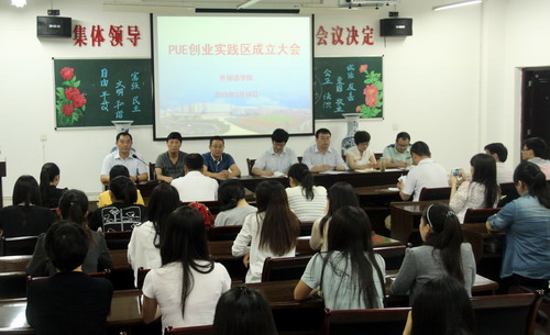 会上,外国语学院教务科负责人宣读了“外国语学院PUE创业实践区实施方案”,学生代表、教师代表、企业代表先后发言,都对PUE创业实践区表示极大的激情,表示倍加珍惜此良机,达到“双赢”。