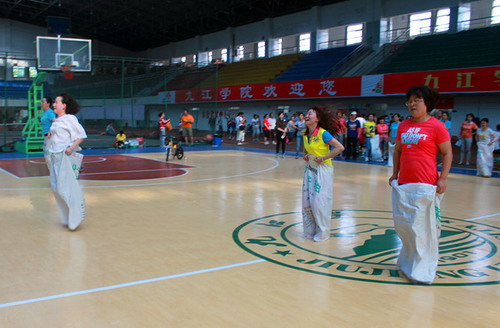 “跳绳接力”需边跑边跳绳一步一步向前迈进,有较高的技巧性;“袋鼠跳”必须做到双脚和袋子合一向前跳动,才能取得较好成绩;“绑腿跳”需要所有选手步调一致,倾尽全力,丝毫不能松懈,才能保证团队的最佳成绩。“搭桥过河”需要团队每个人手脚灵活,快速移动目标,一步一步向终点靠近,这既要考验队员的机智、灵活,又要考验团队的精诚合作和耐心。比赛不仅仅是竞技,更是娱乐。比赛现场,广大教职工兴致勃勃、积极主动地参加到各项比赛中。比赛在轻松而又紧张的氛围中持续了近两个小时,4个赛场都呈现出队员们奋力拼搏,观众们呐喊助威,大家欢天喜地的热闹场面。