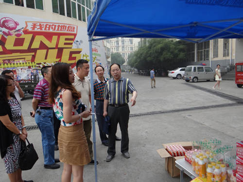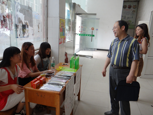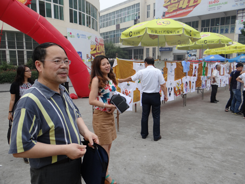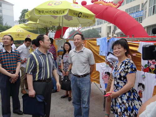 纪副校长一行首先来到四号服务楼,恰逢文传学院T恤展活动正在三食堂广场举行。纪副校长饶有兴趣地观看了同学们设计、绘制的作品,并听取了文传学院领导对活动的介绍。纪副校长称赞道:这项活动很有特色,同学们的设计、绘画能力很好。