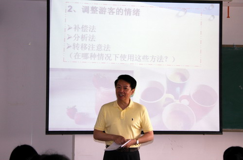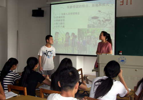 课堂上,乔秋敏副教授围绕“导游带团原则”、“导游带团节奏控制”、“游客情绪控制”等内容进行了细致讲解,通过提问、互动、举例、情境教学等方式,让同学们轻松掌握了主要知识点。