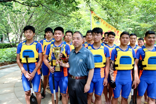 表演赛前,还进行了表彰活动,甘筱青、陶春元以及相关部门负责人,为校龙舟队颁发他们在亚洲大学生龙舟锦标赛获得的奖杯、奖牌。并与他们合影留念。