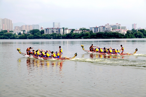 随后,两支龙舟队员们,手提木桨走上龙舟,坐在龙舟中,等待发令。在骄阳下,队员们个个英姿飒爽,精神焕发。随着甘筱青校长一声令下:我宣布庆端午龙舟表演赛,现在开划!两支龙舟,如同两支箭,在如镜的水面上,划出两条水波,队员们在鼓声中,奋力划桨,勇往直前。湖畔上,驻足观赏的人们拿着手机,纷纷拍照,记录这最精彩一瞬间,让中国传统的端午佳节多了一份喜悦和快乐。