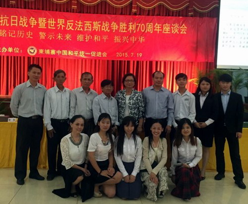 7月19日,由柬埔寨中国和平统一促进会举办的“纪念中国人民抗日战争暨世界反法西斯战争胜利70周年座谈会”在柬埔寨端华分校大礼堂举行。中国驻柬埔寨大使布建国等使馆官员,柬埔寨中国和平统一促进会副会长高华、秘书长黄瑞华,柬埔寨王家研究院孔子学院中方院长帅式毅,在柬华人华侨代表等约500人出席座谈会。孔子学院公派教师及汉语教师志愿者代表20人参加了座谈会。