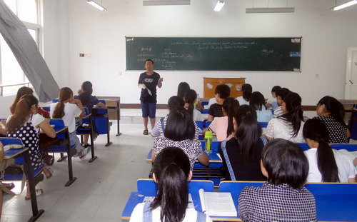 课堂上,熊修春副教授首先用英语介绍了自己、告诉同学们自己的手机号码和电子邮箱,并规定了“四个不准” 的课堂规则。随后,熊老师围绕课本内容,重点介绍了英美文学课程的主要内容,简要介绍英美两国文学各个历史断代的主要历史背景,文学文化思潮,文学流派,社会政治、经济、文化等对文学发展的影响,主要作家的文学生涯、创作思想、艺术特色及其代表作品的主题结构、人物刻画、语言风格、思想意义等,让同学们对英美文学课程有了一个大致的了解。上课过程中,熊老师与学生互动交流,随时提问,肢体语言丰富,课堂气氛活跃。郑书记坐在学生中间,聚精会神地听讲,认认真真地记笔记。