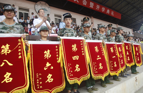 凯歌扬军威,健步抒豪情。金风送爽,丹桂飘香。初秋时节,九江学院洋溢着青春和喜庆的气息,2015级新生为期9天艰苦紧张的军训即将落下帷幕。9月16日上午,2015级新生军训总结表彰大会暨开学典礼分别在主校区和浔东校区隆重举行。