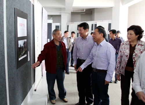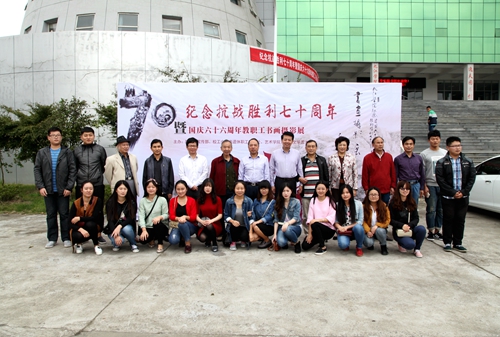 金秋流彩,丹桂飘香。10月9日上午,由校党委宣传部、校工会、离退休职工管理处、艺术学院、老年文学艺术协会联合举办的“纪念抗战胜利七十周年暨国庆六十六周年教职工书画摄影展”在逸夫楼图书馆一楼展览厅正式开展。校领导郑翔、甘筱青、吴桃娥、王万山、魏立平、杨耀防来到展厅,欣赏和观摩教职工的书画摄影优秀作品。