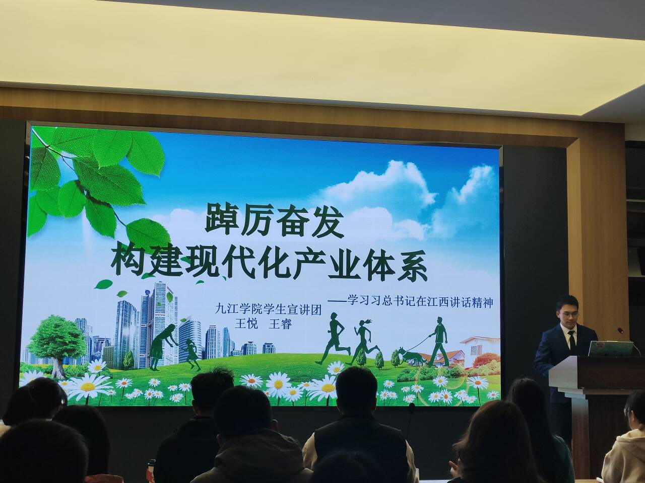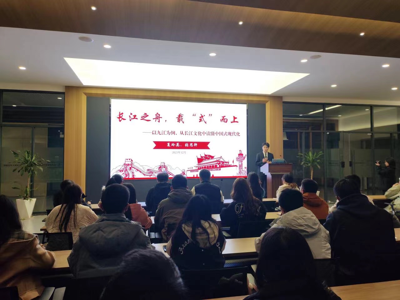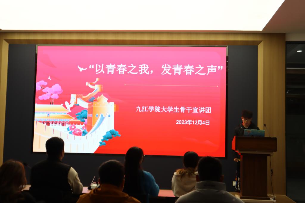 “同学们,以中国式现代化全面推进中华民族伟大复兴的新蓝图已然绘就,长江之舟,乘势而上,广大青年必须挺膺担当,以更加自信自强的精神姿态保护好、传承好长江文化,助力长江之舟劈波斩浪,推动中国式现代化行稳致远。”12月4日晚,在九江学院大学科技园研讨室内,九江学院青马宣讲团成员张思轩的话音刚落,报告厅内立即响起热烈的掌声。