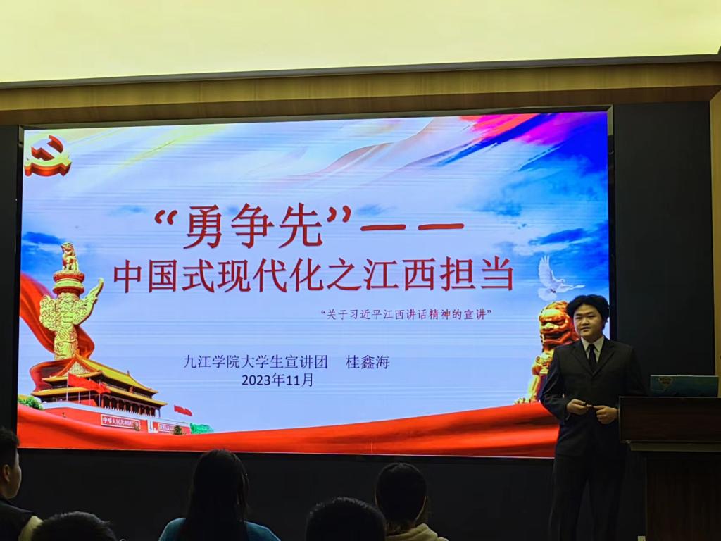 为学习贯彻习近平总书记考察江西重要讲话精神,发挥理论宣讲凝心聚气作用,彰显新时代青年大学生的担当作为,推动党的创新理论入脑入心,九江学院青马宣讲团开展习近平总书记考察江西重要讲话精神主题宣讲。