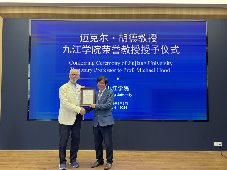 副校长王万山为迈克尔·胡德颁发了九江学院荣誉教授聘书。