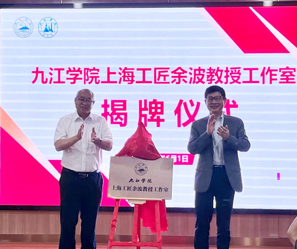 复旦大学附属浦东医院院长余波与九江学院校长陈小林共同为九江学院上海工匠余波教授工作室揭牌。
