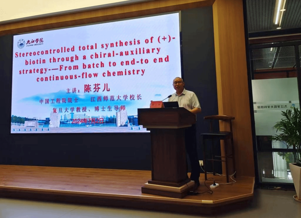 7月2日下午,中国工程院院士、江西师范大学校长、复旦大学博士生导师陈芬儿教授应邀为我校师生作题为《Stereocontrolled total synthesis of (+)-biotin through a chiral-auxiliary strategy - From batch to end-to-end continuous-flow chemistry》的学术报告。报告会由校长陈小林主持,江西师范大学副校长项国雄,我校副校长严平,化学化工学院、资环学院、临床医学院和药生学院相关专业师生在大学科技园报告厅现场聆听了院士的精彩报告。
