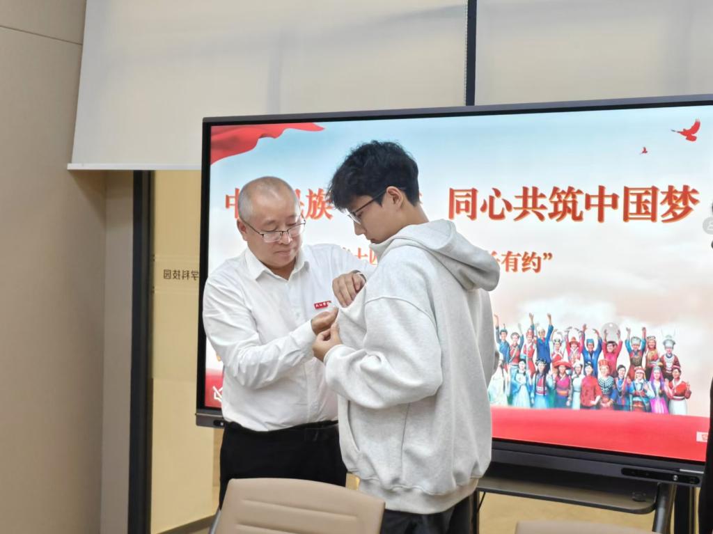 活动接近尾声时,陈小林为各位同学佩戴校牌并合影留念,现场洋溢着和谐温馨的氛围。