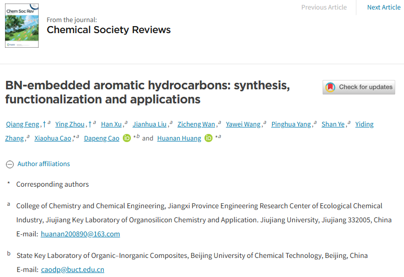 近日,我校化学化工学院有机智能材料创新团队在硼氮有机功能分子构筑及应用研究领域取得突破进展,相关成果“BN-Embedded Aromatic Hydrocarbons: Synthesis, Functionalization and Applications”发表于国际顶级期刊《Chemical Society Reviews》(《化学会评论》)上。这是我校首次以第一完成单位在《Chemical Society Reviews》发表学术论文。化学化工学院冯强博士为该论文第一作者,黄华南教授、曹小华教授为通讯作者,北京化工大学曹达鹏教授为共同通讯作者。