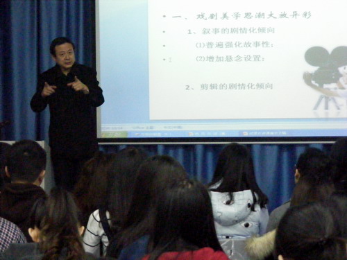 王玮导演讲座的主题是“中国广播文艺节目的衍变”。他在讲座中,将中国广播文艺节目的发展按照时间进行了梳理。针对播音主持艺术专业学生的需求,王导还结合自己曾经做过节目主持人的经历,分析了主持人从业形象的改变。提出主持人不再是过去播音员式的,而是要在训练发声与表达能力之余,加强内在涵养的提升。他勉励在座学生多读书,读好书,强化内功建设,为迎接职业挑战做好充分知识储备。