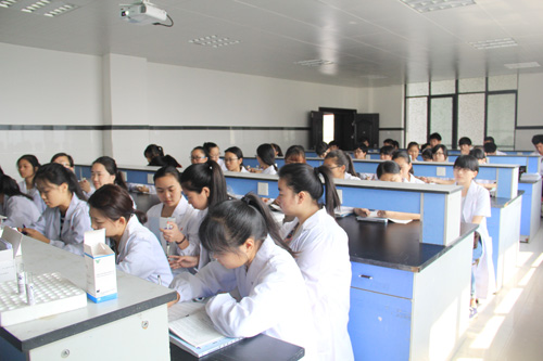 检验科何巍巍老师分理论教学和实验示范两部分,详细讲解了“活化部分凝血活酶时间测定”和“血浆凝血酶原时间测定”两个实验。何老师准备充分,条理清晰,深入浅出地进行授课,风趣幽默的语言吸引同学们聚精会神听讲,积极互动,课堂纪律良好。胡副院长对同学的实验操作进行指导,激发同学们的发散性思维,并亲切询问同学们在焕然一新的实验室的听课感受。同学们高兴地说,感觉很好,教室亮堂、宽敞,实验设备齐全。