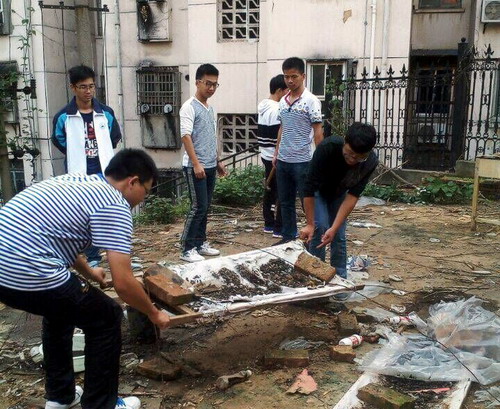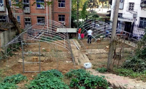在学院的大力支持下,10月16-18日,学院利用运动会和周末时间,学院团委积极组织同学们进行创业基地的基础建设,把已经建好的铁皮屋认真整理,打扫干净整洁。同时,同学们又整理出一块空地,在空地上搭建两个钢管大棚。搭建大棚没有人指导,大家边做边思考,尽量按照图片上图样搭建。由于空地上建筑垃圾很多,埋钢管的洞很难挖,有的同学的手都磨起了水泡,但是大家都没有埋怨,认为是一次锻炼的机会,都想进入创业基地锻炼。