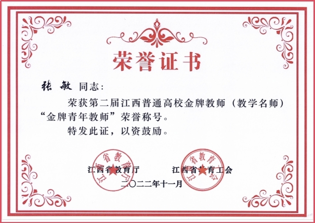 青年教师张敏荣获省级“金牌青年教师”称号