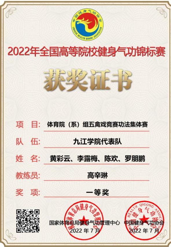 健身气功全国锦标赛冠军证书