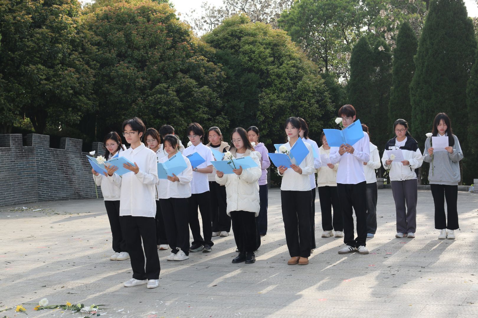 “我们的历史是一部英雄的历史……”朗诵声在陵园上空激荡。同学们齐声诵读散文《英雄》,用字字铿锵的声音与先烈“对话”,铭记峥嵘岁月。广播站成员袁韶宇感慨道:“每一句朗诵都像是在穿越时空诉说,仿佛让我们更加贴近那段烽火硝烟的历史。”默哀仪式后,同学们依次献上白菊,以最朴素而庄重的方式表达无限敬仰与追思。