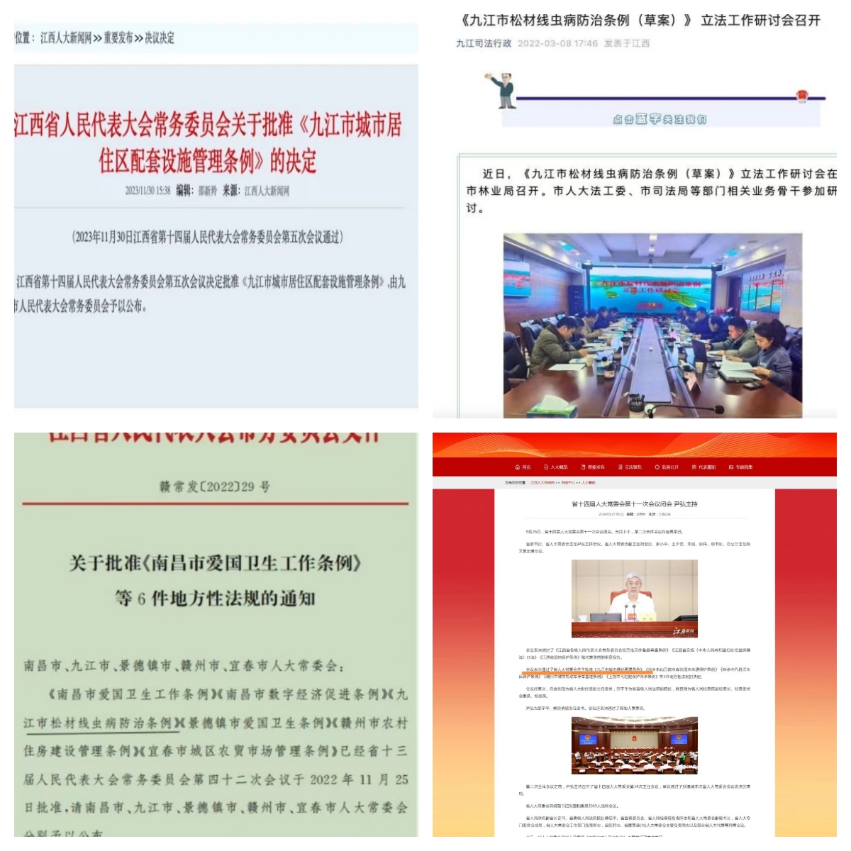 九江学院地方立法研究院成立以来,主持完成《九江市松毛线虫防治条例》、《九江市城市居住区配套设施管理条例》、《九江市城市道路通行管理条例》等九江市立法项目8项,还有3项九江市立法项目尚未完结。立法团队老师认真负责、任劳任怨,受到九江市委、市人大主要领导充分肯定。