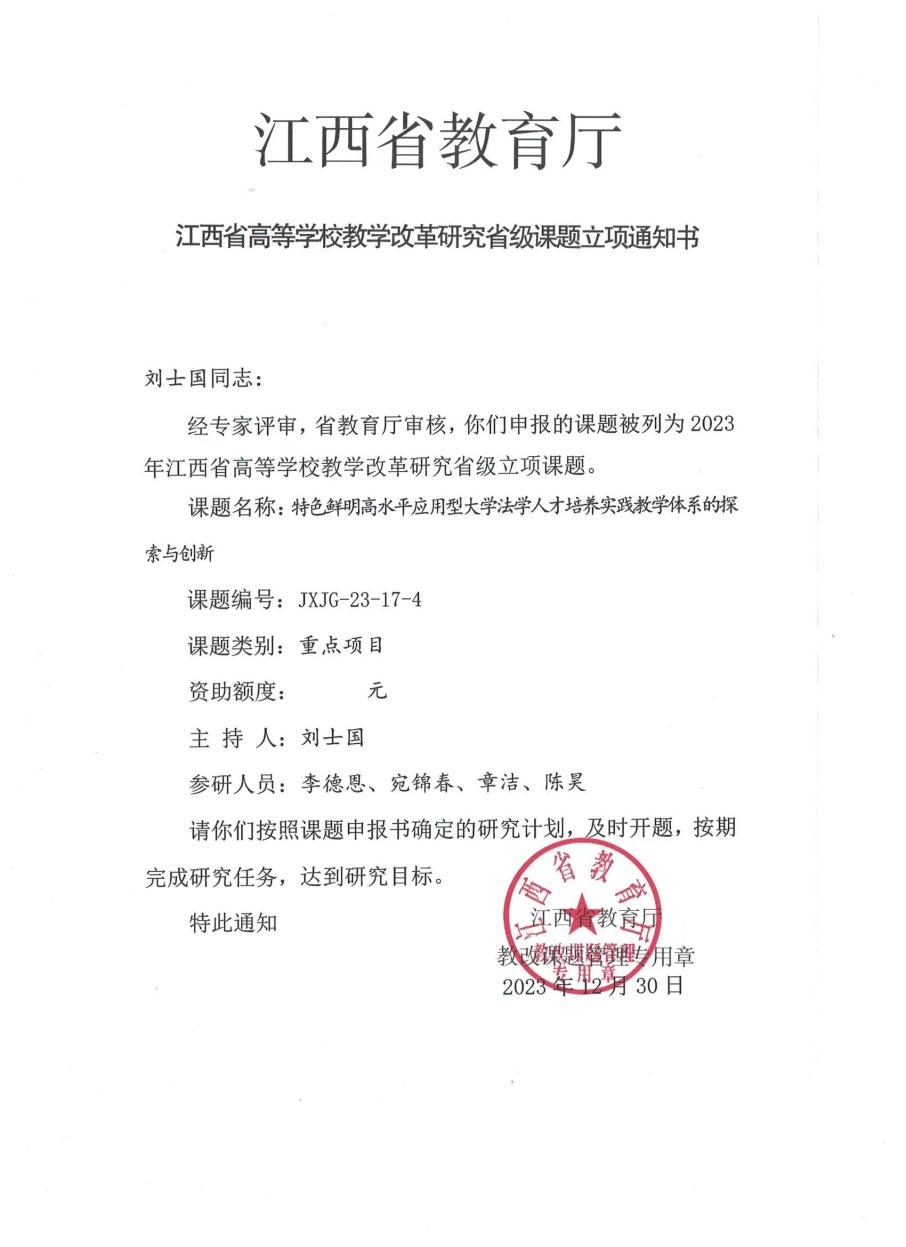 近年来,我院教师积极开展教学研究,取得了较好的成绩。在研教研项目七项,其中刘士国老师主持的《特色鲜明高水平应用型大学法学人才培养实践教学体系的探索与创新》被列为2023年江西省高等学校教学改革研究立项重点项目课题。