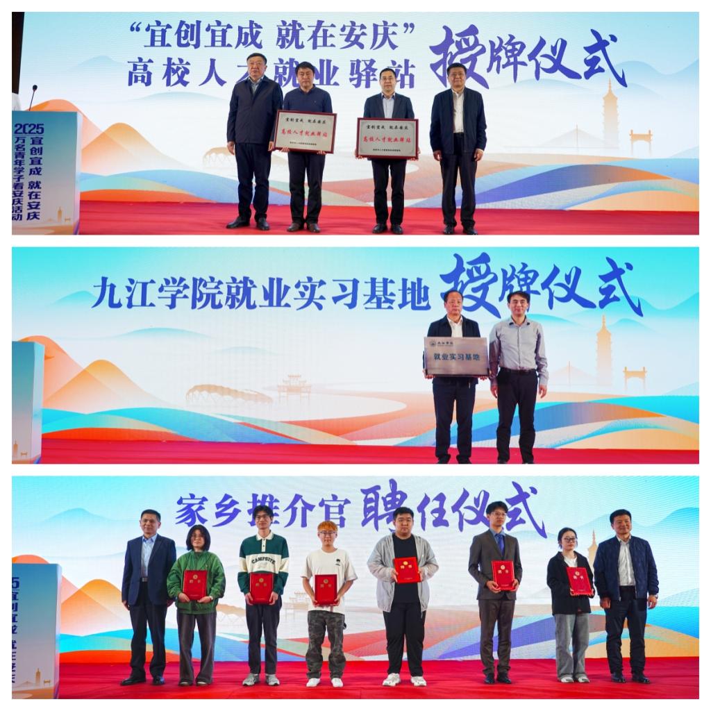 授牌环节,九江学院招生与就业处负责人接受“高校人才就业驿站”牌匾,管理学院负责人向宜秀区人社局授予“就业实习基地”牌匾,我校2025届安庆籍毕业生汪志成、张蕊、叶庆洋受聘为安庆市“家乡推介官”。