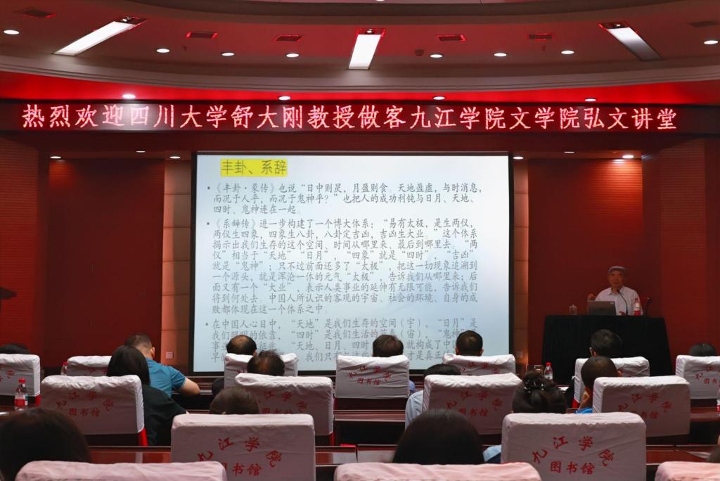 4月29日,九江学院逸夫报告厅内座无虚席,由文学院与庐山白鹿洞书院联合举办的2025年第3期白鹿讲坛暨弘文讲堂·中华诗词经典系列讲座第2期如期开讲。四川大学教授、博士生导师舒大刚以《立事“三本”:苏东坡的家国情怀》为题,带领现场近200名师生及来自社会各界的听众,开启了一场跨越千年的思想对话。副校长王殿元会见舒大刚,双方就传统文化传承与创新展开深度交流。