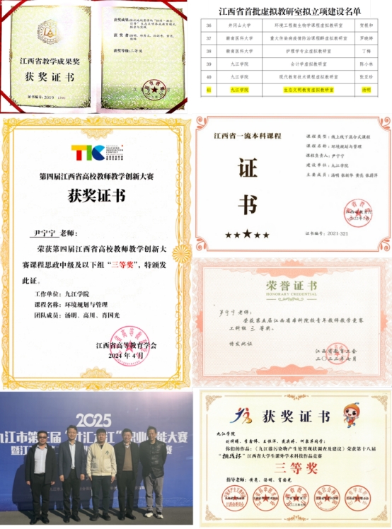 以专业核心课为抓手做好能力培养导向在教学过程中的体现,全面提升课程教学水平。学院获评江西省一流课程1门,校级一流课程4门,校级校企合作课程2门。开展竞赛强师工程,推动教师业务素养与教学能力的全面提升,学院教师获得江西省教学创新大赛三等奖1项,江西省青年教师教学竞赛三等奖1项,九江学院教师课堂教学竞赛三等奖1项。以地域生态文明教育为特色的人才培养经验获评江西省教学成果奖一等奖1项(排名第二)、二等奖1项,获评江西省教学成果奖青年培育项目1项,九江学院教学成果奖特等奖1项、二等奖2项;“问山问水”生态文明教育教学团队为江西省高水平本科教学团队,生态文明教研室获批江西省首批虚拟教研室。