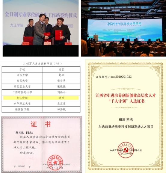 立足江西省“1269”行动计划与九江市“9610”工程,深度实施《九江学院服务九江经济社会发展三年行动计划》,重点对接大中型企业、省市对口职能部门和研究机构。近三年累计承接《全国长江流域生态联合修复九江驻点研究(子课题)》《八里湖新区八里湖水质改善提升方案》《云平台化管控分散式生活污水集中处理SMRT-SBR工艺技术开发》等横向课题20余项,形成地方标准1项,长江大保护工作经验接受CCTV采访报道,服务经费到账超300万元,成果转化总额100万元。