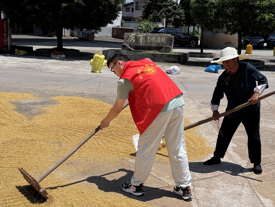 7月3日正午,气温飙至40℃。队员主动协助农户晾晒新收稻谷,队员燕远东的衣衫浸透汗水。“晒1小时稻谷喝光3瓶水,农民却年复一年坚守”,队员在日记里写道。通过亲身实践,队员们深化对国家粮食安全战略的认知,筑牢“把饭碗端在自己手里”的青年使命。
