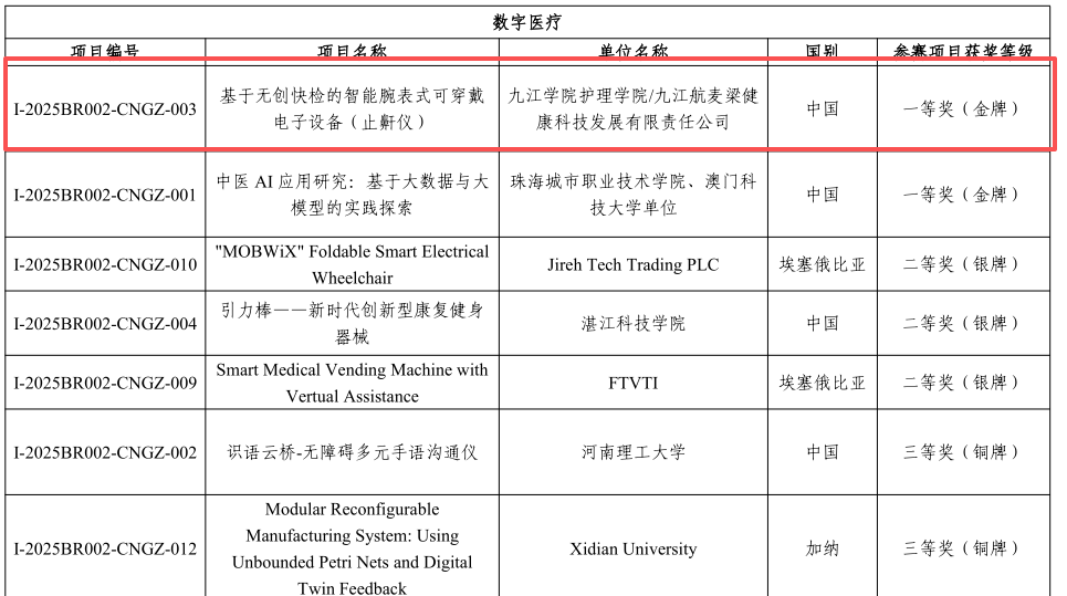 8月24日下午,第十一届国际发明展览会暨“一带一路”金砖国家技能发展与技术创新大赛在广州圆满落幕。我校护理学院袁荣华老师带领学生团队研发的科创项目“基于无创快检的智能腕表式可穿戴电子设备(止鼾仪)A smartwatch-style wearable electronic device (anti-snoring device) based on non-invasive rapid testing”在众多参赛队伍中脱颖而出,在数字医疗赛道中勇夺第一名,首次摘得本届大赛国际发明展览金奖。