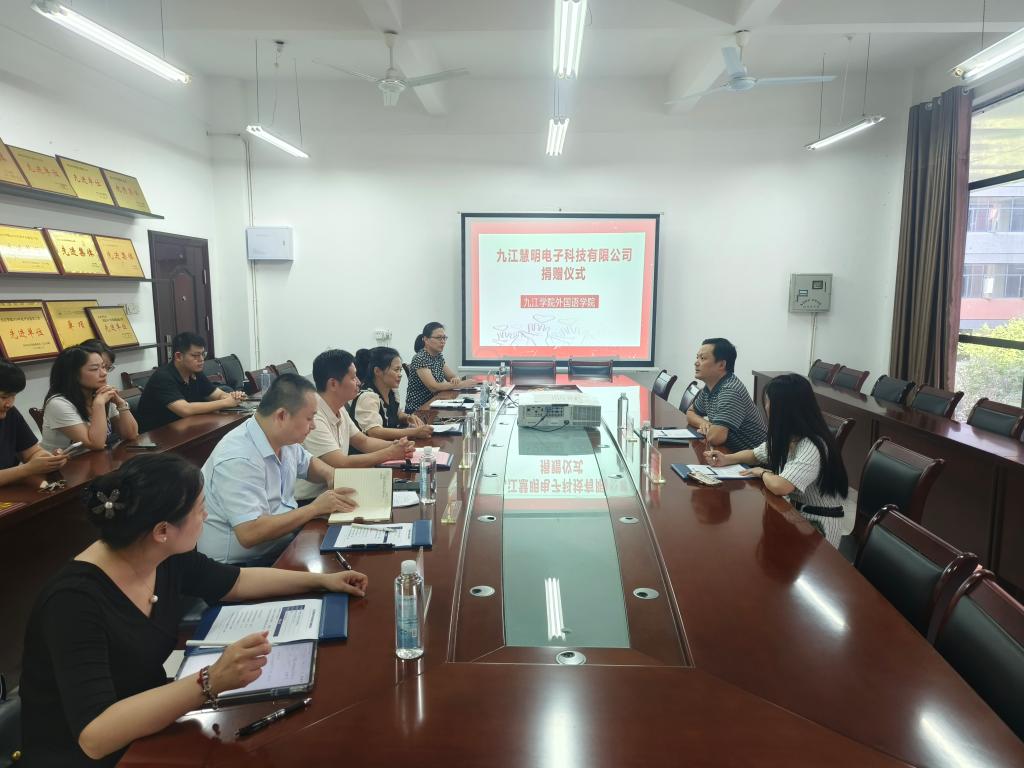 捐赠仪式上,九江慧明电子科技有限公司董事长唐晓明、董事长助理魏小双,以及外国语学院党政班子、部分教师代表共同出席。