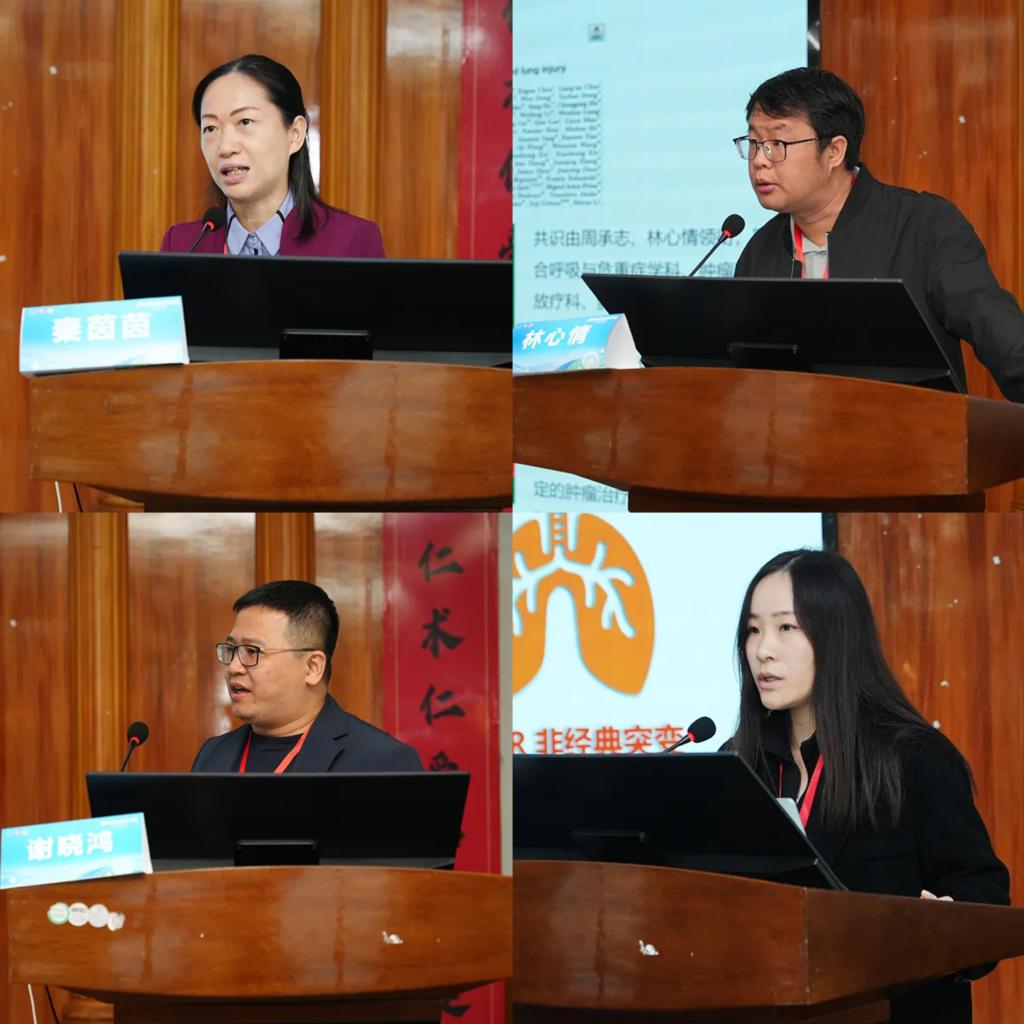 学术研讨环节,广州医科大学附属第一医院呼吸内科秦茵茵教授、谢晓鸿副主任医师、林心情主任医师围绕“呼吸肿瘤发展趋势”“肿瘤相关肺损伤”“EGFR突变晚期肺癌治疗”等热点议题,分别讲授了《一线联合治疗引领EGFR突变晚期NSCLC向更长生存迈进》《呼吸肿瘤过去现在和未来》《肿瘤治疗相关肺损伤共识》课程;九江学院附属医院曹腽博士分享了《少见突变和EGFR非经典突变晚期NSCLC治疗进展》;南昌大学第一附属医院孙龙华主任医师讲授了《循证之巅 脑转首选》。