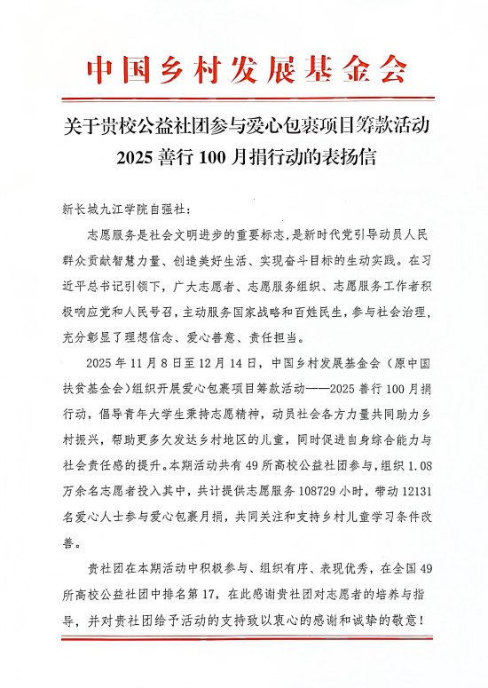 近日,2025年中国乡村发展基金会“善行100”月捐行动表彰大会圆满落幕。我校学生工作处(学生资助管理中心)指导的新长城九江学院自强社凭借突出的组织动员能力与扎实的公益实践,在全国高校公益社团中荣获全国第17名的优异成绩,充分展现了九江学院青年学子的责任担当与奉献精神。