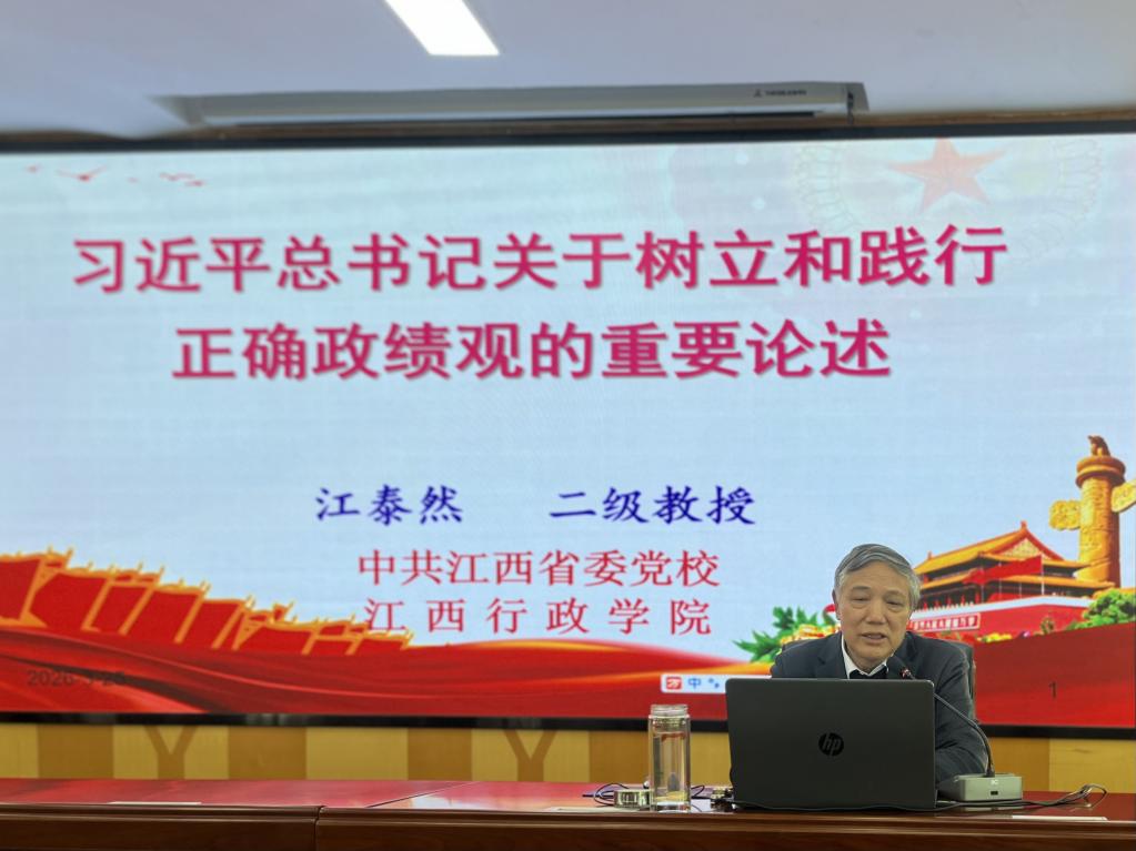 为进一步推进树立和践行正确政绩观学习教育走深走实,3月25日下午,学校举办机关党委第7期“知行大讲堂”,邀请了江西省委党校二级教授、研究生导师、江西省红色基因传承研究基地首席专家江泰然教授作题为《习近平总书记关于树立和践行正确政绩观的重要论述》的专题辅导报告。机关各部门处级干部、党员代表共90余人聆听了报告。