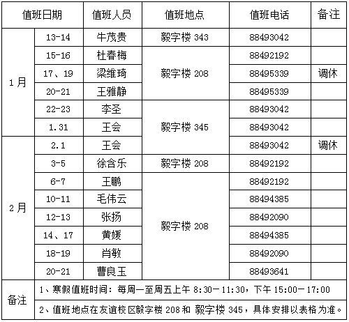 为保证寒假期间学校师生正常办事,现将有关研究生院值班安排通知如下: