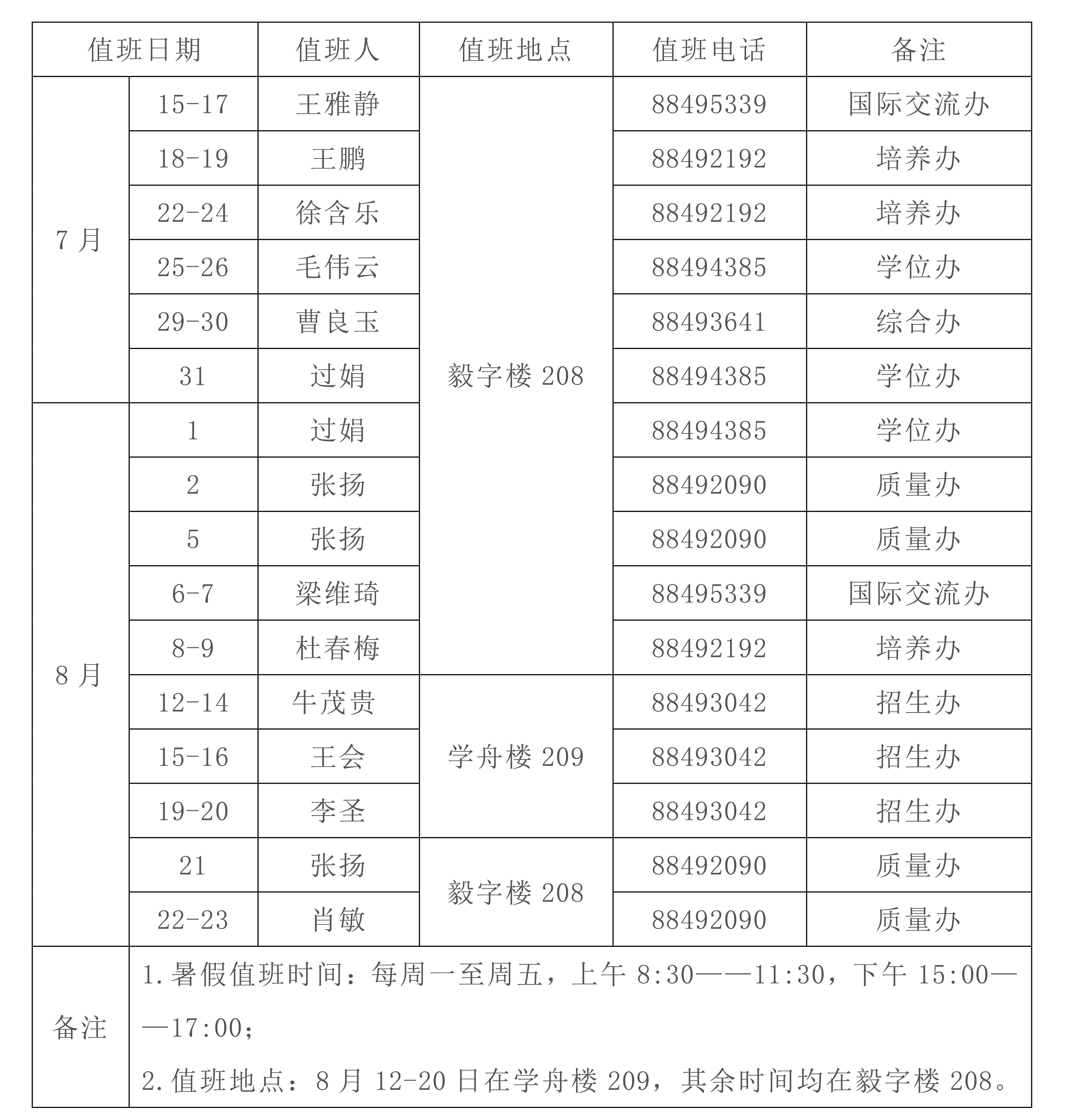 为保证暑假期间学校师生正常办事,现将有关研究生院值班安排通知如下: