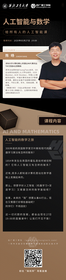 300年前的英国数学家贝叶斯和现代的机器学习算法有怎样的联系? 1854年发生在英国的霍乱是如何被控制的?它和人工智能又有怎样的联系?还有,很多人都知道计算机是站在数学基础上发展起来的。那么,想要学好人工智能(机器学习+深度学习)又需要怎样的数学基础呢?如果,未来的“我”想要从事AI行业,现在又需要打好哪些基础呢?同学们!不用困扰!这一切问题的答案,都会出现在27日19:00的直播课中!让我们不见不散!