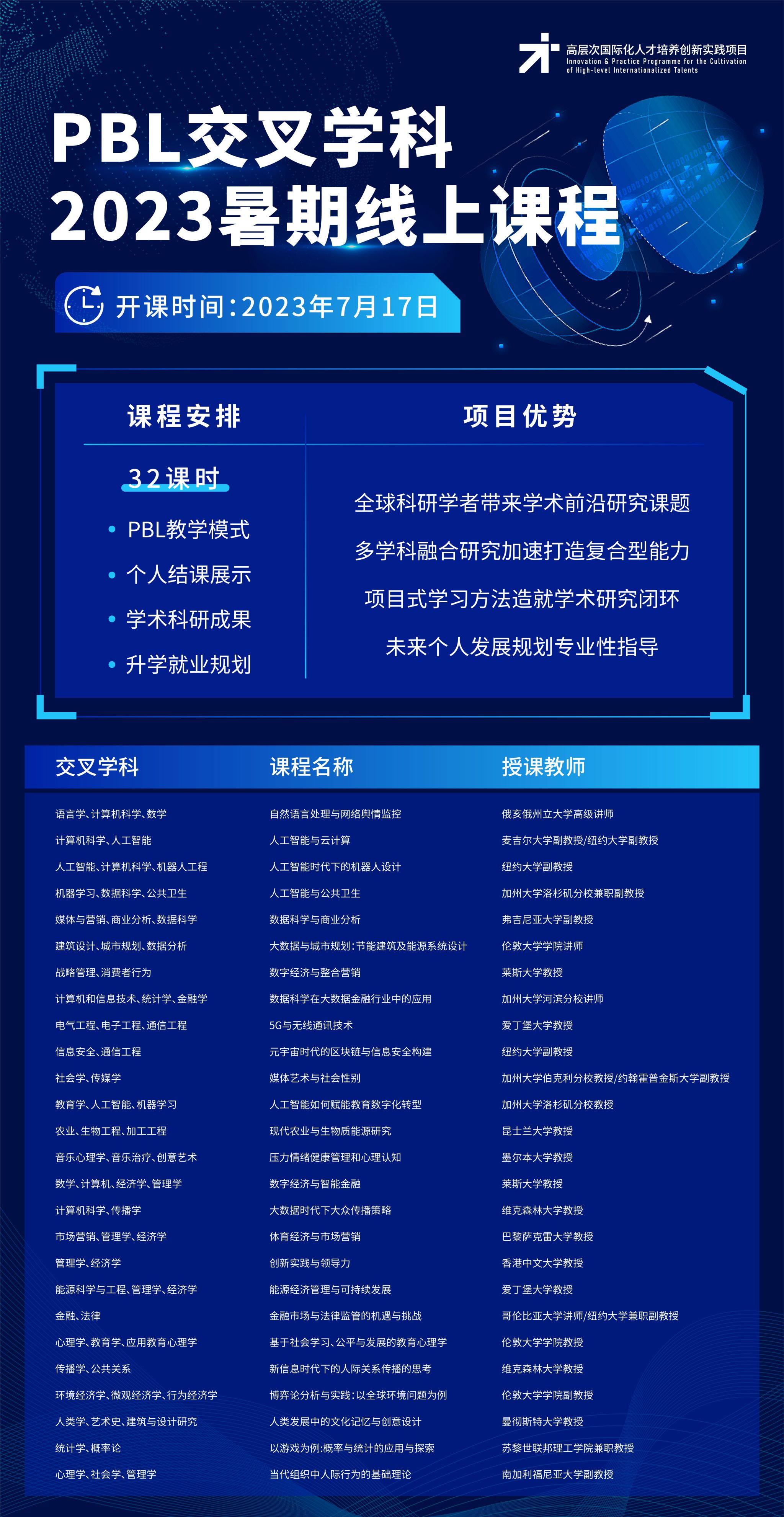 为深入贯彻落实党的二十大精神,有效提升学生会语言、通国家、精领域的专业科研能力以及全球治理能力,为我国参与全球治理和构建人类命运共同体提供人才支撑,现面向全校本科生、研究生推出“高层次国际化人才培养创新实践项目——2023年暑假PBL交叉学科线上课程”,欢迎各位同学踊跃报名。
