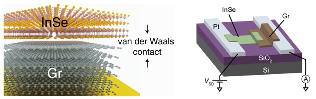 2.实现了高质量的金属-二维半导体肖特基接触界面的构筑,设计并制备了范德瓦尔斯型二维硒化铟肖特基二极管。