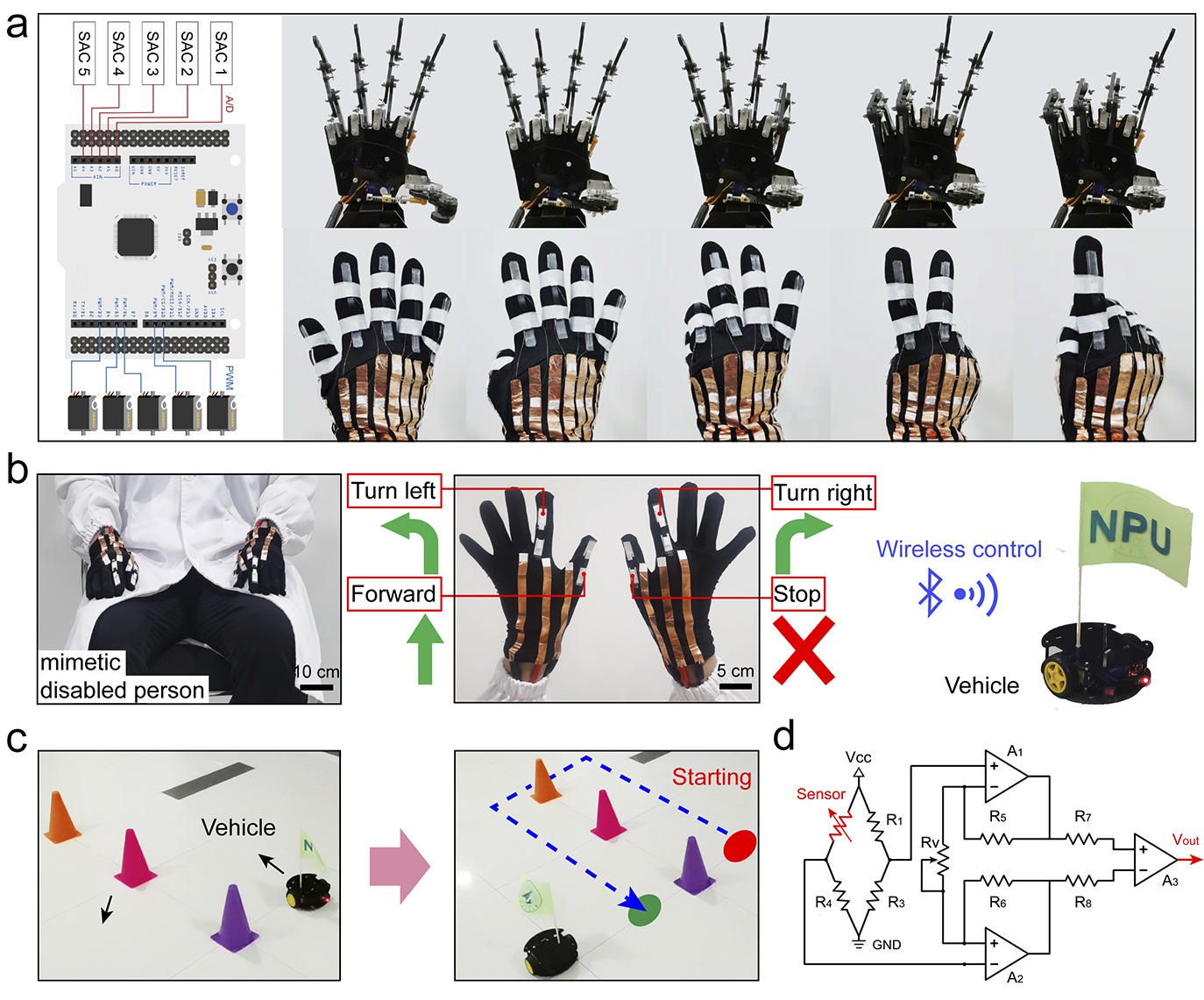 本项目制备的柔性应变传感器在人机交互和人机操控的领域中显示出巨大的应用潜力。将传感器固定在“智能手套”的手指关节处,即可通过信号采集电路和控制电路收集传感器在人体手指弯曲过程中的电阻变化并将其转换为传输至微控制单元的输出电压信号。随后,微处理器控制电机的旋转,导致机械手指弯曲,可以使机械手准确、快速地对人体的手势作出实时响应。此外,还基于该系统进一步设计了基于柔性应变传感器无线操控智能车的应用场景,实现远程操控智能车定向移动和避障,有助于开发人-机一体化的应用于特殊作业环境的无线操控装备。