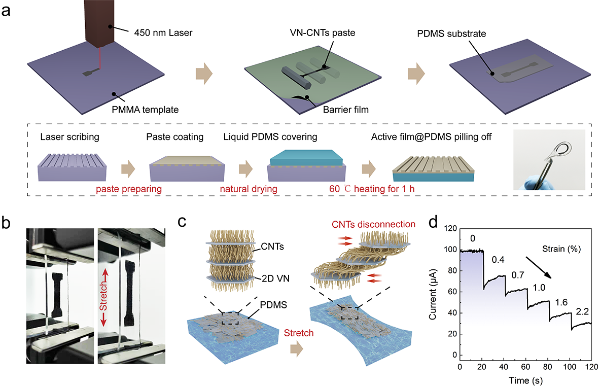 首先提出了一种简便且经济高效的制备金属性气凝胶混合材料的原位合成策略,首次使用垂直排列的N掺杂碳纳米管阵列修饰氮化钒纳米片(VN/CNTs)。其中,氮化钒(VN)具有导电性高、形貌设计灵活和高比表面积的优点,对于柔性设备非常有利。此外,结合VN和原位生长的CNT阵列构建高导电三维网络结构,提供了额外的电导率,从而有效促进了重叠的纳米材料之间的电荷输运,以达到提高灵敏度的目的。此外,通过高效、可控的脱氧-氮化策略,合成了高电导率的氧掺杂氮化钒(VNO)纳米片。VNO材料的金属特性和二维形貌,使其特别适用于制备高性能的可拉伸应变传感器。进一步,基于钒基纳米材料分别采用激光模板转移法和覆膜转换法制备了高性能柔性应变传感器,具有高的灵敏度、宽的检测范围、高耐用性和快速响应。