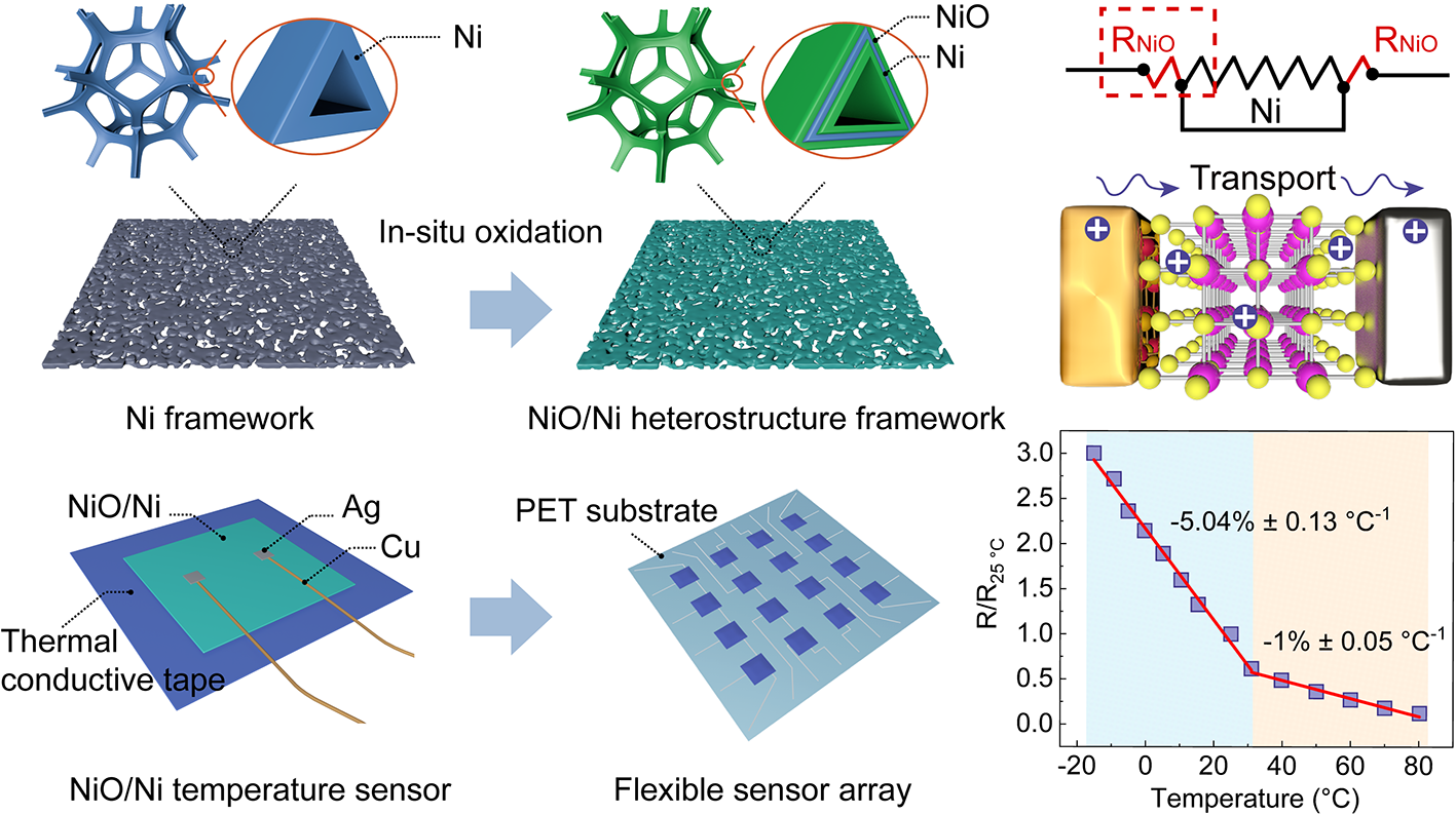 提出一种简单、高效的原位NiO/Ni异质结“自控门”器件的制备技术,并将其应用在高性能可穿戴温度传感器中。所制备的器件由于具有特殊的金属-半导体-金属结构,展现出高效的电荷输运性能、优异的导热性能、灵敏的温度传感性能和超高的稳定性能,适用于物体表面和人体温度信号的实时监测。此外,采用喷墨打印技术制备了基于高性能温度传感器的柔性温度传感阵列,可对空间温度场进行精准分辨和成像,在人机界面、智能医疗系统等领域展现出广阔的应用前景。