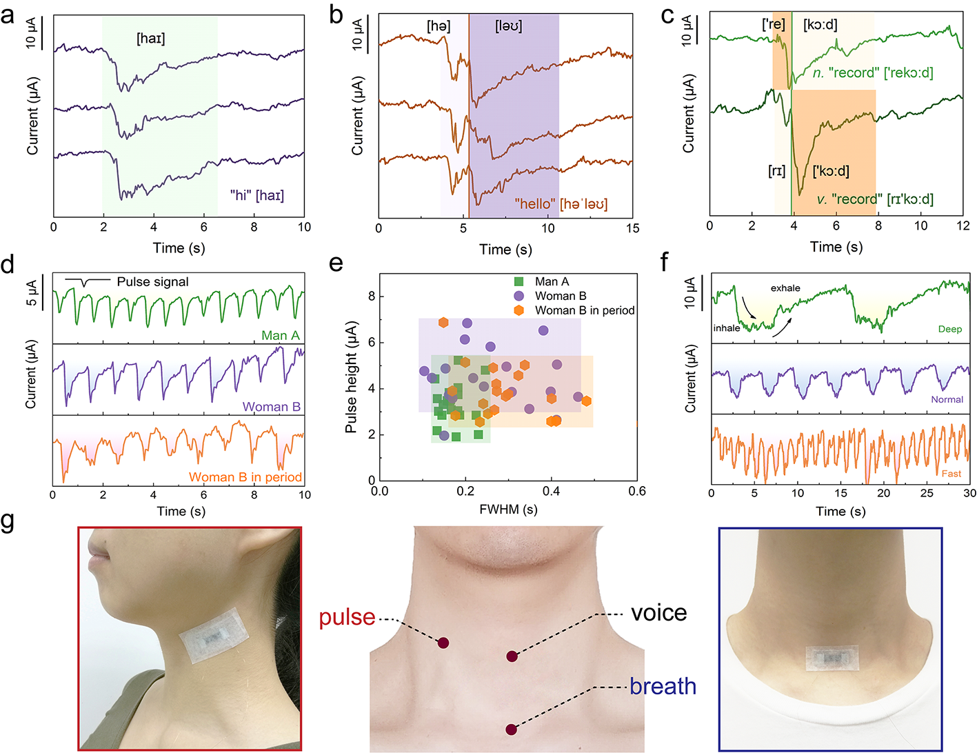 所制备的柔性传感器由于其具有高灵敏度可以用于检测人体各种生理信号。首先是人体关节运动的大应变信号,如手指、手腕、手肘、膝盖等关节部位的运动状态。此外还可以检测人体生理活动引起的人体皮肤震动的微弱型号,如声音信号、动脉脉搏信号和呼吸信号。将柔性传感器贴于人体的声带部位,可以清楚地区分不同的单词以及不同的重音节,这为智能语音识别提供了可能性。将传感器贴于颈部,可以识别来自不同个人以及相同个人的不同生理状态的实时脉搏信号。此外,将传感器贴于咽喉部位,通过检测食道附近肌肉的运动,可以监测人体的呼吸行为(如呼吸频率等),用于实时监测呼吸系统疾病,如哮喘等。此外,本工作研究的传感器具有可穿戴舒适性,薄的导电传感层有利于人体皮肤热量快速消散,对于可穿戴的舒适性具有重要意义。