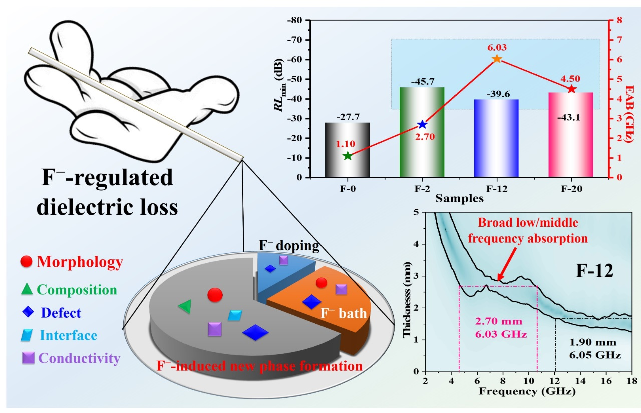 通常来说,在微波频段内(2-18 GHz),高性能的电磁波吸收材料应满足“薄,轻,宽,强”的基本要求。此外,近两年5G通信技术(工作频率在2–6 GHz)的高速发展,对中低频吸波材料的研制提出了新的挑战。为了实现这一目标,众多国内外科学家进行了广泛的研究。然而,目前大多数的吸波材料对电磁波的响应和损耗仍然多集中在高频范围(12-18 GHz),在中低频(2-12 GHz)范围内的宽频电磁波吸收还鲜有报道。基于上述问题,受“氟老大(电负性最大的非金属元素)”的启示,本项目进一步创新性地提出了一种氟离子(F−)调控策略。以二元钴镍(Ni-Co)金属硫化物为研究对象,研究发现,材料的形貌、组分、界面、缺陷和导电性这“五味中药”,可以通过氟离子这位医术精湛的“中医之手”来进行有效的调控(如图3所示)。具体而言,通过灵活地调节氟离子的浓度大小和引入方式(原位引入或后氟化处理),可以使其能够以不同“角色”(即掺杂、形成新物相或氟离子浴)实现对上述“五味中药”的差异化“供给”,进而达到优化材料电磁参数和微波吸收性能的目的。这项工作不但系统阐述了氟离子在化学合成、微观结构设计和电磁波吸收中的独特作用,而且为目前5G通信技术中急需解决的低/中频电磁干扰问题提供了可行的思路。